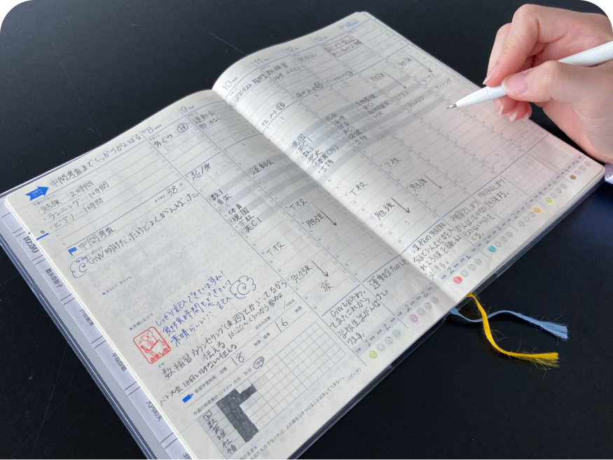 生徒は授業の予定をはじめ、考査・模試の成績、進路目標などの情報を書き込みます。教員は生徒一人ひとりの状況を把握し、学習方法などのアドバイスに活かしていきます。